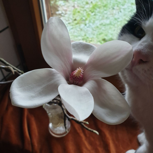 Auf einen genauen Tag zu achten, ist aber optional. In den letzten Jahren erinnerte ich mich meist mit dem ersten eiskalten Wind daran, Zweige zu schneiden - etwa Mitte November bis Anfang Dezember. Die Zweige blühten dann im Laufe des Dezembers. In diesem Jahr habe ich die Zweige tatsächlich am 4. Dezember geschnitten - als Mitbringsel für die jahreszeitliche Schreibstunde - und der Zweig, eine Magnolie, blühte schließlich am 23. Dezember.